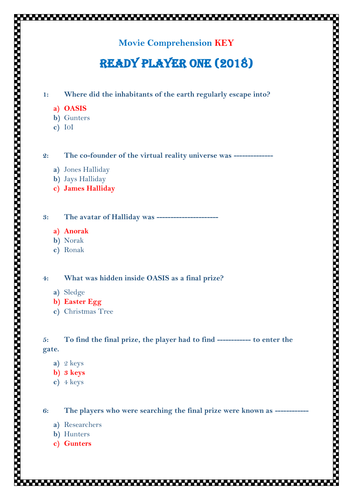 Movie Ready Player One 2018 Comprehension Worksheet With Key Teaching Resources